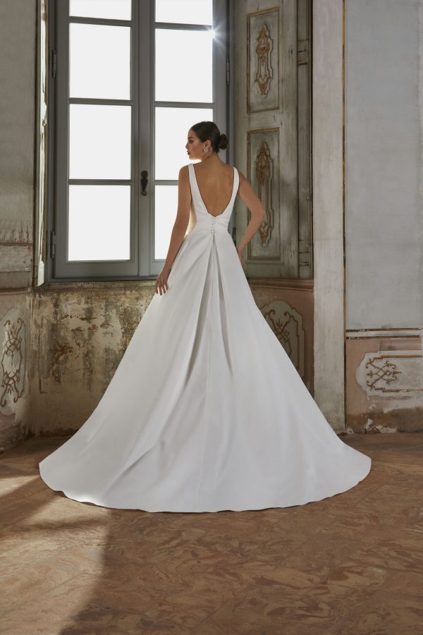 Experimentarás una sofisticación elegante, un romance moderno y un ajuste perfecto cuando optes por el estilo 8242. Este diseño presenta un corpiño con cuello en V, una cintura ceñida y una falda en forma de A en capas que revela elegantemente un vistazo de la pierna.
