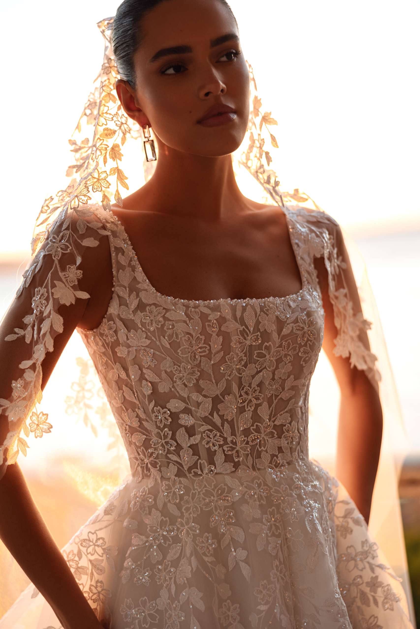 Un equilibrio de ensueño entre gracia y modernidad, este vestido presenta un refinado escote cuadrado y delicados tirantes que enmarcan el escote con sutil elegancia. El estilo 8275 combina encaje bordado con una falda de tul vaporosa, creando una silueta desenfadada que se siente fresca y atemporal
