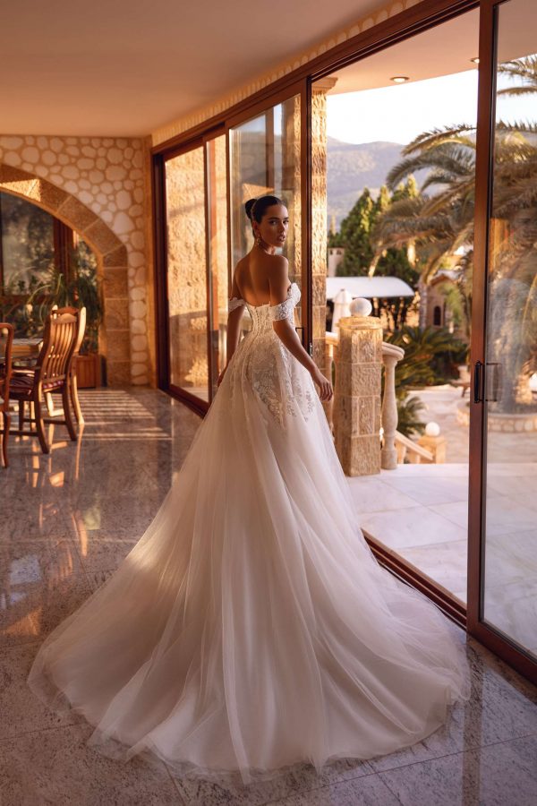 El estilo 8280 es la personificación de la elegancia refinada. El romántico escote de hombros descubiertos y el intrincado corpiño de encaje con cuentas ofrecen un hermoso contraste con la vaporosa falda de tul, creando una silueta esculpida y etérea. La base de encaje añade profundidad a la fluida cola, mientras que las mangas a juego incluidas aportan un toque de fantasía y versatilidad.