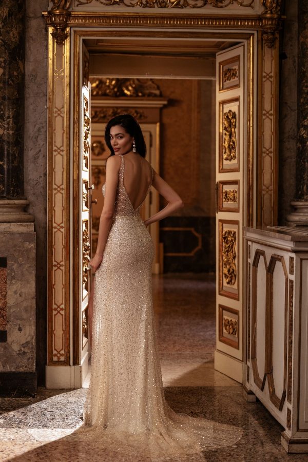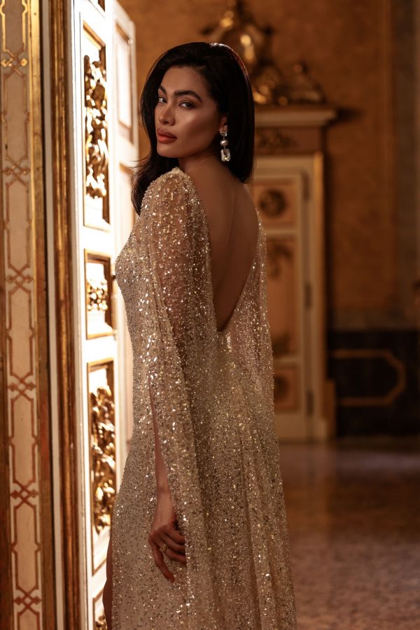 Goldie está diseñado para la novia que busca brillar. Este elegante vestido está confeccionado íntegramente en tul con cuentas doradas.