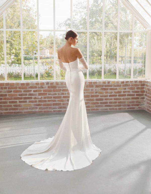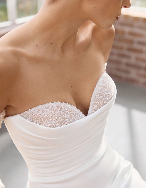 Vestido en estilo sirena está realizado en raso sedoso con un precioso un escote bustier drapeado con detalles de pedrería. Una sensación de doble look se logra gracias a las mangas largas de pedrería extraíbles.